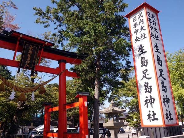 ナナーズ川上店の看板『NANA’S』『Calafate nana』を背景を入れてブルベカードを撮影し、ゴールにてスタッフに見せてください。 - PC3 生島足島神社鳥居横の看板「式内大社日本中央生島足島神社」