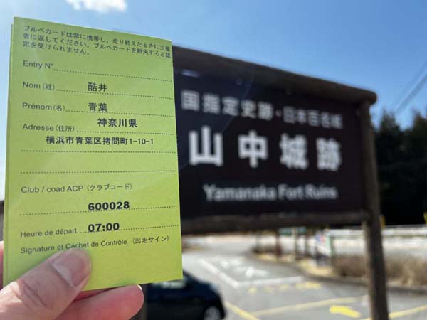 国指定史跡・日本百名城 山中城跡の看板を背景に入れて当日お配りするブルベカードの参加者名が書いてある面を撮影し、ゴールにてスタッフに見せてください。左右どちらの看板でも結構です。 - PC4 金太郎生家跡地