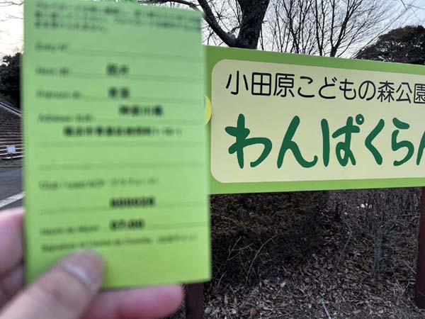 わんぱくらんどの看板を背景に入れて当日お配りするブルベカードの参加者名が書いてある面を撮影し、ゴールにてスタッフに見せてください。